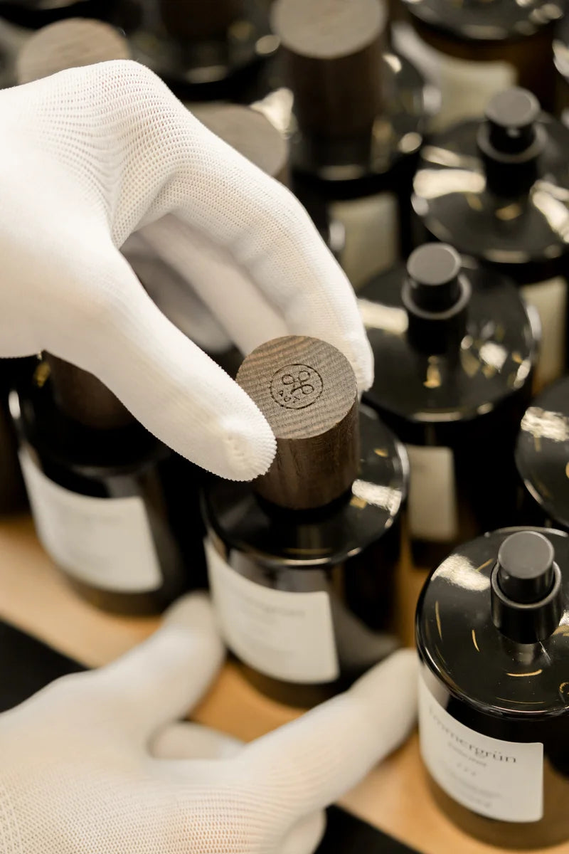 In Europa gefertigt und in unserer Manufaktur befüllt. Mit fest verschlossenem Spraykopf und Stöpsel aus gebeizter Esche – gehalten von einem patentierten Korkverschluss. Er trägt unser Meisterzeichen.